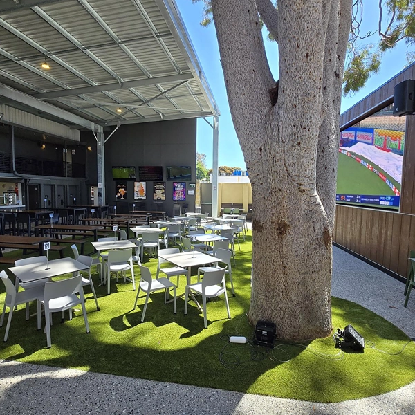 Create standout hospitality spaces with lightweight, low‑maintenance artificial grass for commercial interiors, rooftop gardens, and bars in Perth. Our systems are engineered for rooftop and balcony use, combining Water‑Cell for vertical drainage with geo‑fabric to stop synthetic grass infill from blocking outlets. The result is a realistic surface that stays cleaner and drier, without the flat, shiny look of cheap fake grass. Pair artificial turf with Melos Stone—non‑slip, porous, and lighter than typical aggregate paving—for safe, attractive circulation areas, terraces, and planter surrounds. From green walls and indoor features to outdoor lounges and bar seating zones, we tailor load, drainage, and edging details to suit venue requirements.